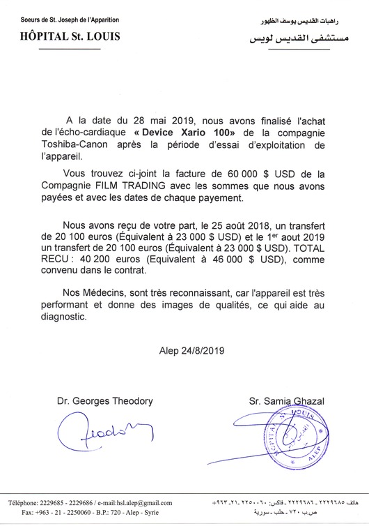 Historia zakupu echokardiografu: w drugiej połowie roku 2018 Fundacja zawarła umowę ze Szpitalem św. Ludwika w Aleppo na sfinansowanie zakupu ultrasonografu Toshiba Nemio-XG Premium (model z roku 2011) za 46 000,00 USD. Inne nowsze modele nie były dostępne w Syrii w roku 2018. Na początku roku 2019 zaistniała możliwość dostarczenia szpitalowi najnowszego modelu echokardiografu. Producent zgodził sie na wymianę ww. ultrasonografu na echokardiograf Device Xario 100 (model z roku 2018) za dopłatą 14 000,00 USD, którą Szpital pokrył z własnych funduszy.
